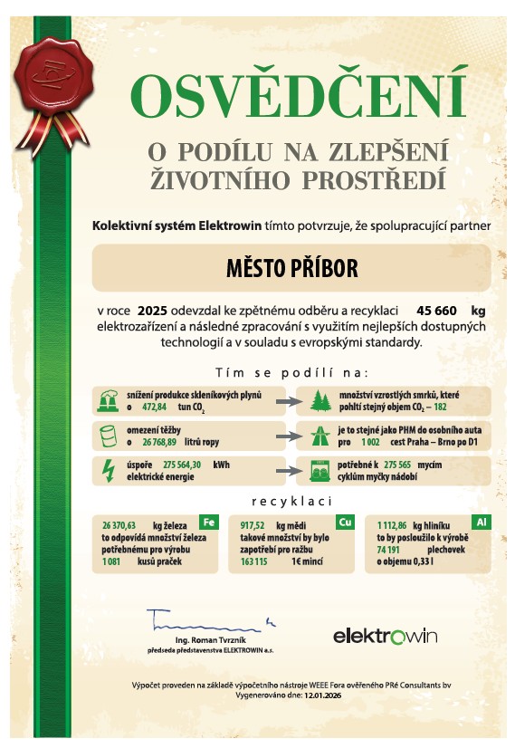 Konkrétní přínos obyvatel vyčísluje Osvědčení o podílu na zlepšení životního prostředí, které na základě dosažených výsledků vystavil kolektivní systém pro sběr a recyklaci vysloužilých spotřebičů Elektrowin.